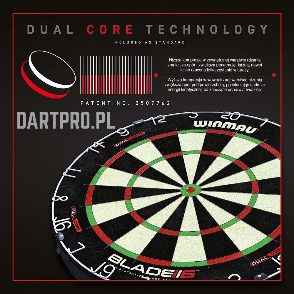 Blade 6 Dual Core jest ewolucją modelu Blade 6, wprowadzając dwuwarstwowy rdzeń. Zewnętrzny, miększy rdzeń, zwiększa komfort gry, umożliwiając lepszą penetrację rzutek i efektywniejsze "samoleczenie" tarczy. Wewnętrzny, twardszy rdzeń, jest zaprojektowany tak, aby pochłaniać nadmiar energii kinetycznej, zwiększając tym samym trwałość i żywotność tarczy. Ryzyko wypadnięcia z tarczy nawet bardzo lekko rzuconej lotki jest minimalne. Ten model jest idealny dla graczy, którzy oczekują równowagi między jakością a ceną.