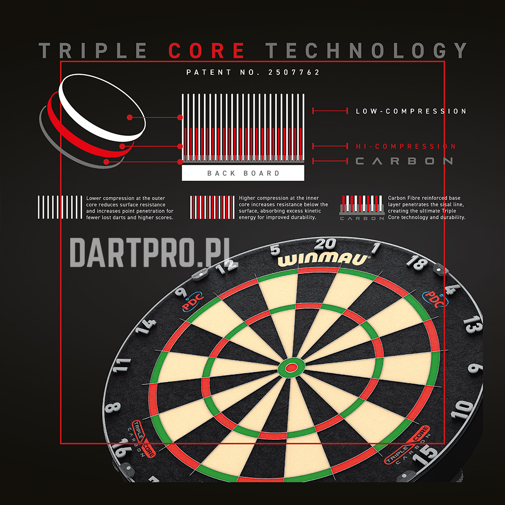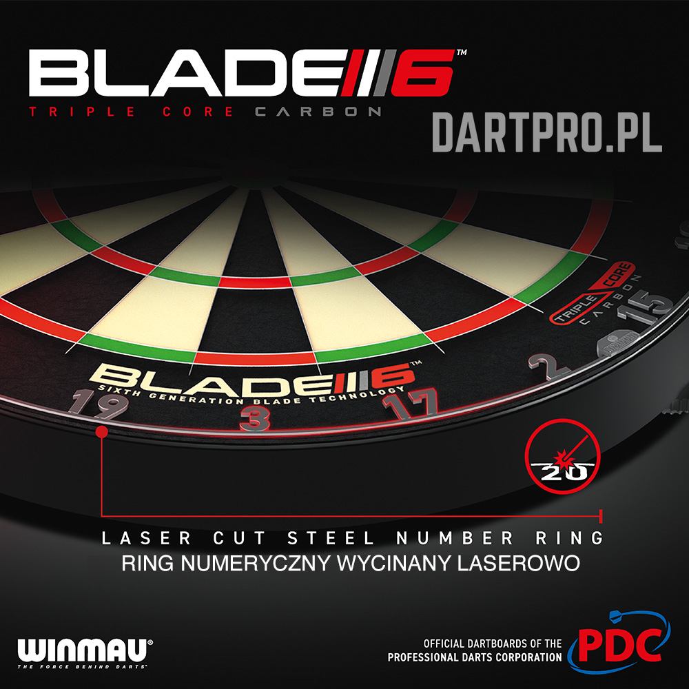Model Blade 6 Triple Core jest uważany za najbardziej innowacyjną tarczę w ofercie Winmau. Trzywarstwowy rdzeń, w tym wewnętrzna warstwa wzmocniona włóknami węglowymi, zapewnia niespotykaną dotąd trwałość i wydajność. Dodatkowo, laserowo cięty, antyrefleksyjny pierścień numeracyjny nie tylko podnosi estetykę, ale również redukuje odblaski, co jest istotne w profesjonalnym darcie. To właśnie na tarczach Blade 6 Triple Core rozgrywane są najważniejsze mecze, takie jak mistrzostwa świata, co świadczy o ich wyjątkowej jakości. Dodatkowo w zestawie znajduje się dedykowana poziomica do idealnego ustawienia tarczy. Porównanie wyglądu tarczy Blade 6 vs Triple Core.