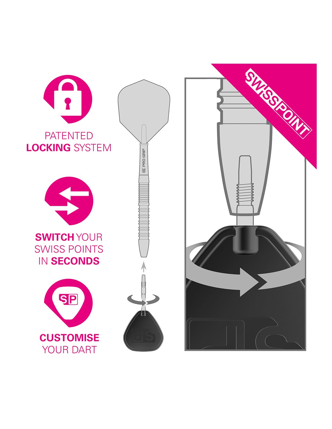 Swiss Point to opatentowany system wymiennych grotów, który umożliwia zmianę w kilka sekund. Kieszonkowe narzędzie Swiss Point to wszystko, czego potrzebujesz, aby usunąć i wkręcić nowe groty.