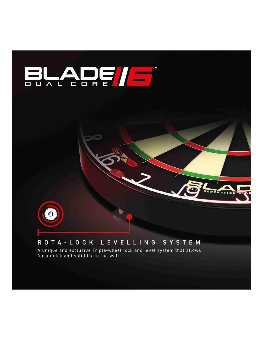Winmau Blade 6 wyposażono w system ROTA-LOCK, który umożliwia montaż i poziomowanie tarczy na praktycznie każdej powierzchni.
